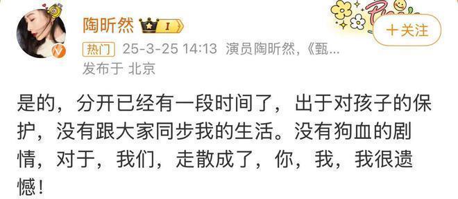 从陶昕然配文来看,陶昕然与自己的丈夫何建泽已经正式正式分开,其配文称:是的,分开已经有一段时间了,出于对孩子的保护,没有跟大家同步我的生活。没有狗血的剧情,对于,我们,走散成了,你,我,我很遗憾!